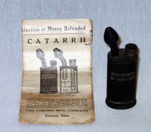 The New Corona Generator was made in Kenton Ohio. It was an inhaler for administering volatile pine oil for a variety of conditions, including; asthma, catarrh, bronchitis and grippe. The accompanying leaflet has a detailed explanation of nasal anatomy and questions to help self-