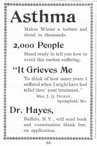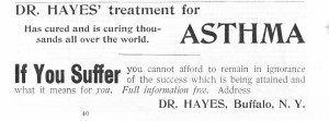 Dr Hayes’ treatment, originating from 1883, was advertised between 1895 and 1903, testifying that thousands had benefited from this cure. The treatment was described as eliminative and reconstructive.