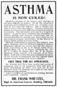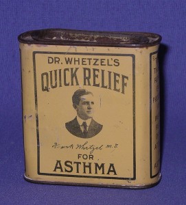 Dr Whetzel’s powder was advertised in the early 1900’s in the USA as a cure for asthma.  From their Chicago HQ, free trial was offered to all applicants. Endorsement from country-wide medical experts was claimed.
