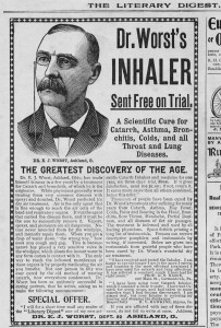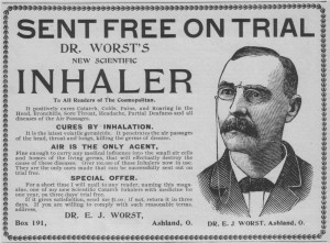 Dr Worst’s inhaler, patented March 19th 1901, is a beautifully crafted and elegant inhaler measuring about 10 cm. This dry air treatment for asthma, bronchitis and similar conditions was claimed to have cured thousands of people. The advert is from 1907. The photo below shows that the Worst inhaler went on to become the Co-