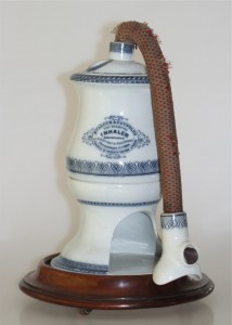 This splendid ceramic inhaler is an ‘Eclectic inhaler’ and is described in the book entitled ‘The Laryngoscope’ (1871 London) written by the famous physician Morell Mackenzie. He, in fact, refers to it as ‘my Eclectic inhaler’ and goes into great detail of its working (see extract below), so he may well have been the inventor. The photograph shows the inhaler (with mouthpiece) and bears the names of Bullock & Reynolds (a London pharmacy) and says manufactured by S.Maw Son & Thompson, which dates it to 1870 - 1900.