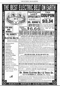 This US advert from 1898 shows the Dr Horne electric belt.  This amazing device was warranted to cure a host of ailments from asthma to varicocele. Normally $20 but only $6.66 if you use the coupon. The UK advert (1891) not only cures bronchitis, but prolongs life too!