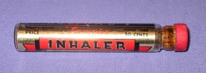 A glass inhaler with oils of; camphor, eucalyptus, pine and mustard. The Minneapolis based company, originated in 1889, claimed that the 50 cent inhaler would last several years - it is still going strong!