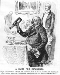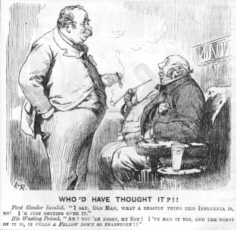 Punch magazine through the late 1800’s and 1900’s frequently captured the social impact of influenza. Several of the cartoons are pictured here (two from 1891, the other from 1936).