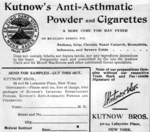 This advertisement from The Medical Sentinel (Portland, Oregon), 1897, for Kutnow’s powder & cigarettes, claims to cure hay fever, and claims to be an excellent remedy for asthma and many other pulmonary conditions. It contains no lobelia or datura (common ingredients of other powders) or other ingredient detrimental to the heart.