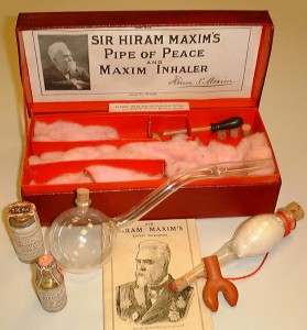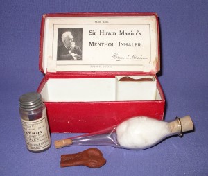 Sir Hiram Maxim, an American, living in London, was an inveterate inventor.  Most famous for the Maxim machine gun, he also invented a steam driven flying machine! Plagued by the effects of the London atmosphere in the early 1900’s he developed and patented his own inhaler.  It resembled a glass retort and delivered a combination of menthol and pine essence (dirigo). Included in the pack is a separate bulbous glass inhaler for nasal delivery of menthol.  This was also available separately (see second picture).