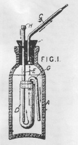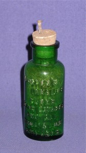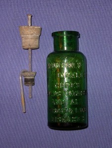 The Munyon’s inhaler shown here, together with the figure from the 1899 patent, is almost complete, simply missing the fine mouthpiece tube and a small test tube. The green glass is embossed with the words, “Munyon’s inhaler cures colds, catarrh and all throat & lung diseases” it also has the words, “patented” and “fill to the line” on the back. The UK patent was published in 1899 in the name of James Monroe Munyon. It was designed to enable the in-