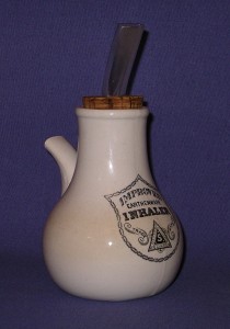 The Savars vapour inhaler is another example of the same type as the earthenware Improved Dr Nelson inhaler. This is quite a small example, just 12.5 cm (5 inches). Directions for use are printed on the back. It recommends that infusions have boiling water poured over the ingredients, whereas liquid and volatile medicines should be added to the boiling water already in the inhaler. Savars also sold another inhaler, the ‘popular’ inhaler, similar to the Boot’s Hygienic inhaler, it is pictured below..