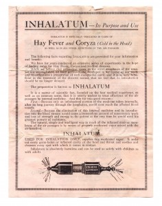 This device from Colorado was sold just after the end of WW1 when Spanish influenza was killing millions worldwide. The patented Steven’s pocket vaporizer was used to deliver medicated vapour (inhalatum) either through the nose or mouth. Claims included; hay fever, asthma, nasal catarrh, whooping cough and influenza.  It contained ether but no opiate, cocaine or narcolytic.