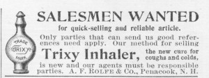 This advert from Youth Companion 1899 is seeking to recruit responsible salesmen to promote the Trixy inhaler. The pictures below were kindly provided by Dr Abramovitz. They show the inhaler and its complete packaging.