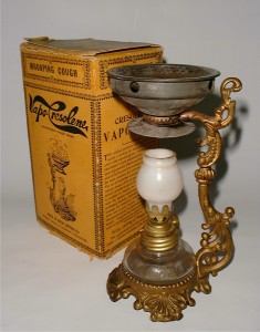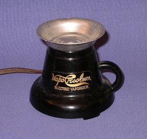 The Vapo-Cresolene inhaler, used from 1879 and advertised from the 1890’s through into the 1920’s. Sold by the Vapo-Cresolene company and for some time distributed by Allen & Hanbury. Indicated as a specific for whooping cough and suitable for asthma, coughs, croup and colds. The Vapo-Cresolene spirit burner eventually was replaced by the electric vaporizer (pictured).