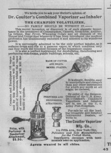 Dr Coulter’s combined vaporizer and inhaler known as the Champion Volatilizer pictured here was advertised as being of gigantic importance for all diseases of the throat and lungs. Eucalyptus oil and creosote were recommended to kill the bacilli of tuberculosis while essence of cinnamon was advised for killing the bacilli of typhus. This was a steam driven inhaler made of copper, brass and nickel plate. The advert is from 1892.